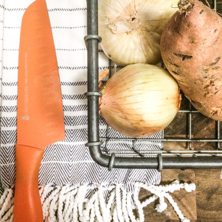 chopping these + browning sausage with herbs de provence + roasting garlic rosemary sweet potatoes 🍴 the best smelling kitchen, the happiest girl //