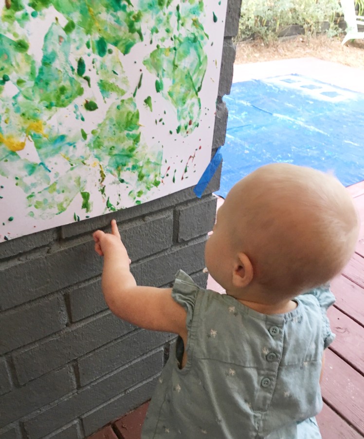 Once she was all bathed and clean {which BTW was SUPER EASY!!! This paint rinses away with water} she loved looking at her artwork. All of the colors mesmerized her and all she wanted to do was touch the {wet} paint! So next time, maybe we will try painting easel-style. Thoughts?