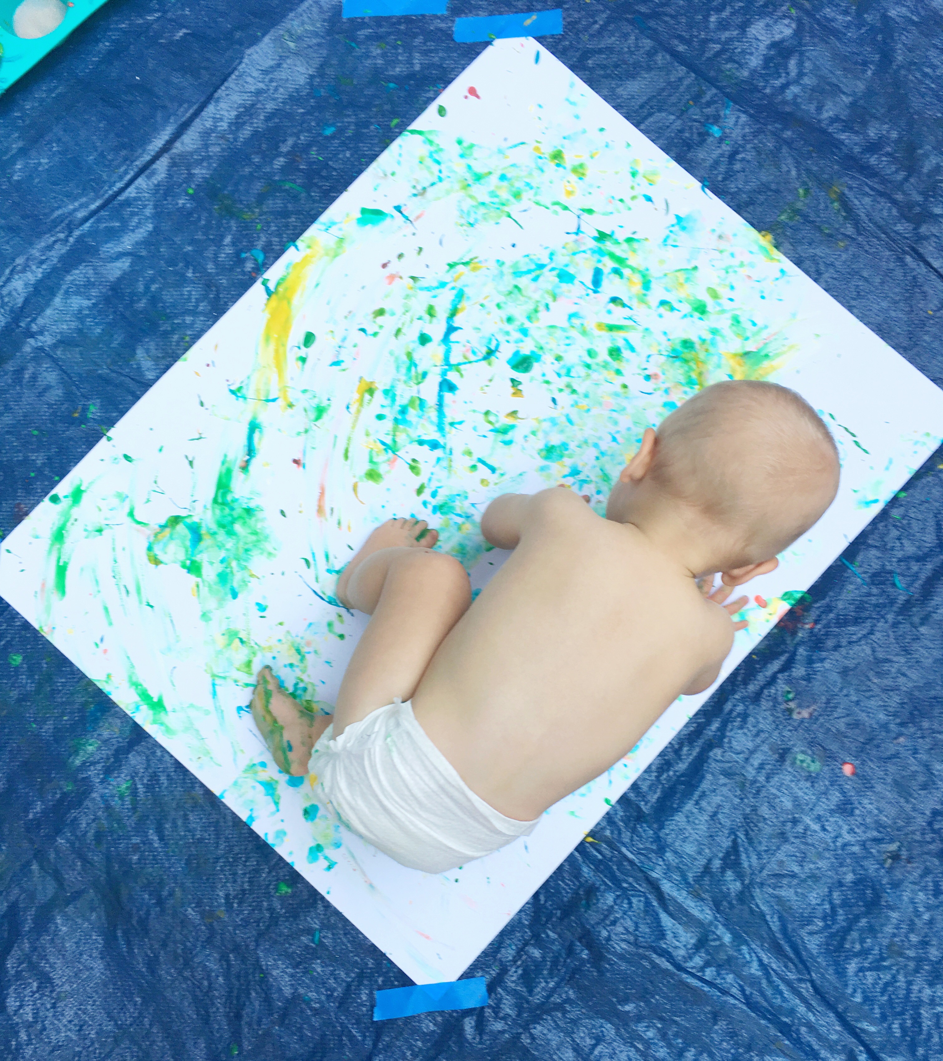 Once she was all bathed and clean {which BTW was SUPER EASY!!! This paint rinses away with water} she loved looking at her artwork. All of the colors mesmerized her and all she wanted to do was touch the {wet} paint! So next time, maybe we will try painting easel-style. Thoughts?