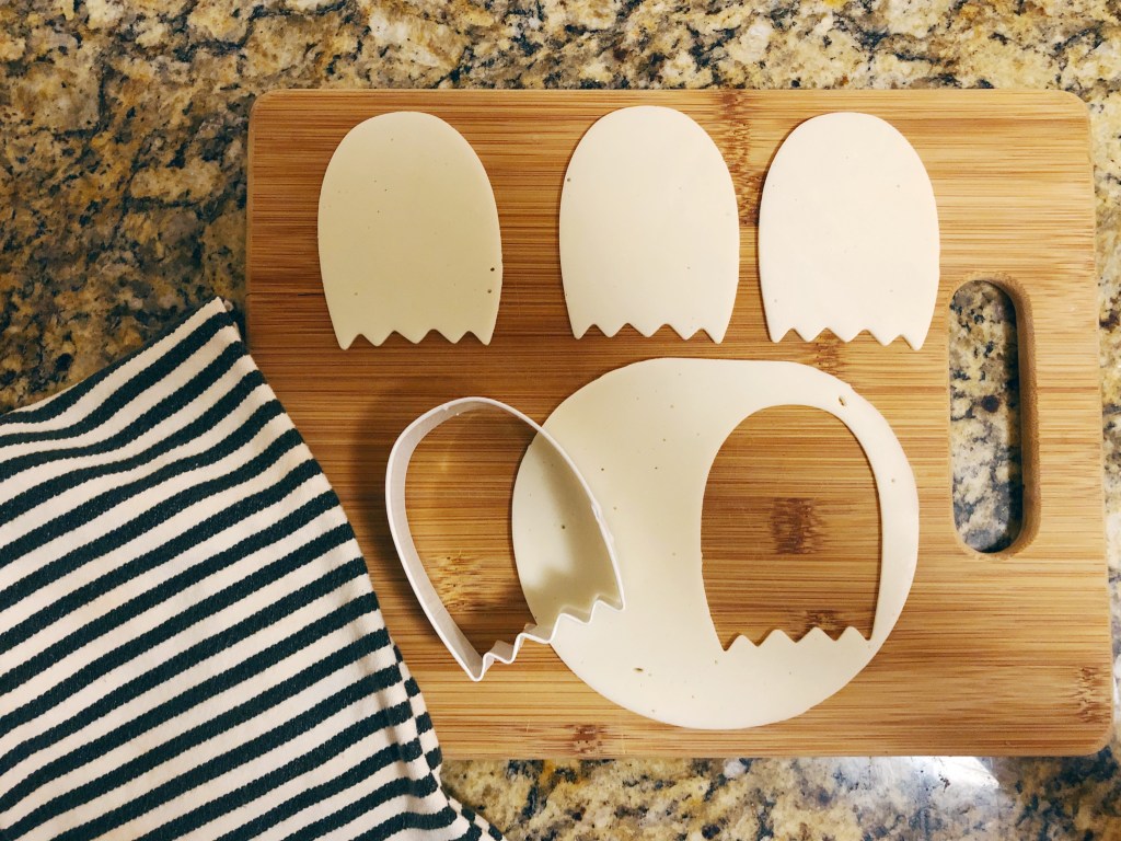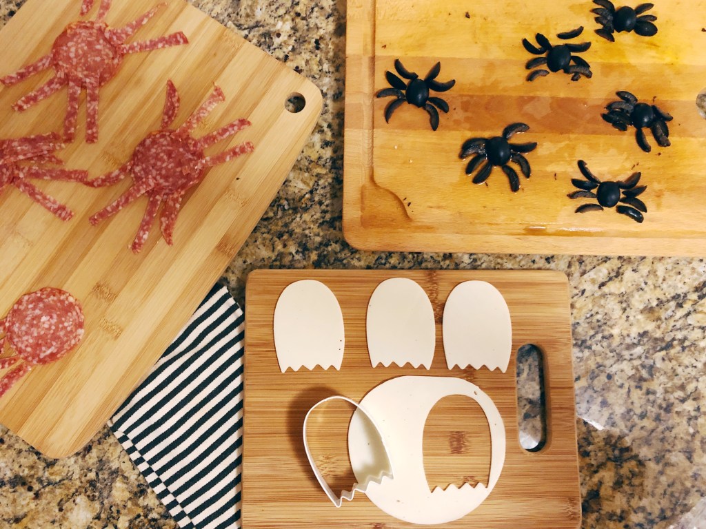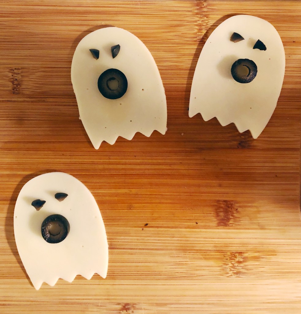 Next we used this ghost cookie cutter to cut the slices of provolone cheese into friendly ghost shapes. I was able to get two ghosts on each slice.