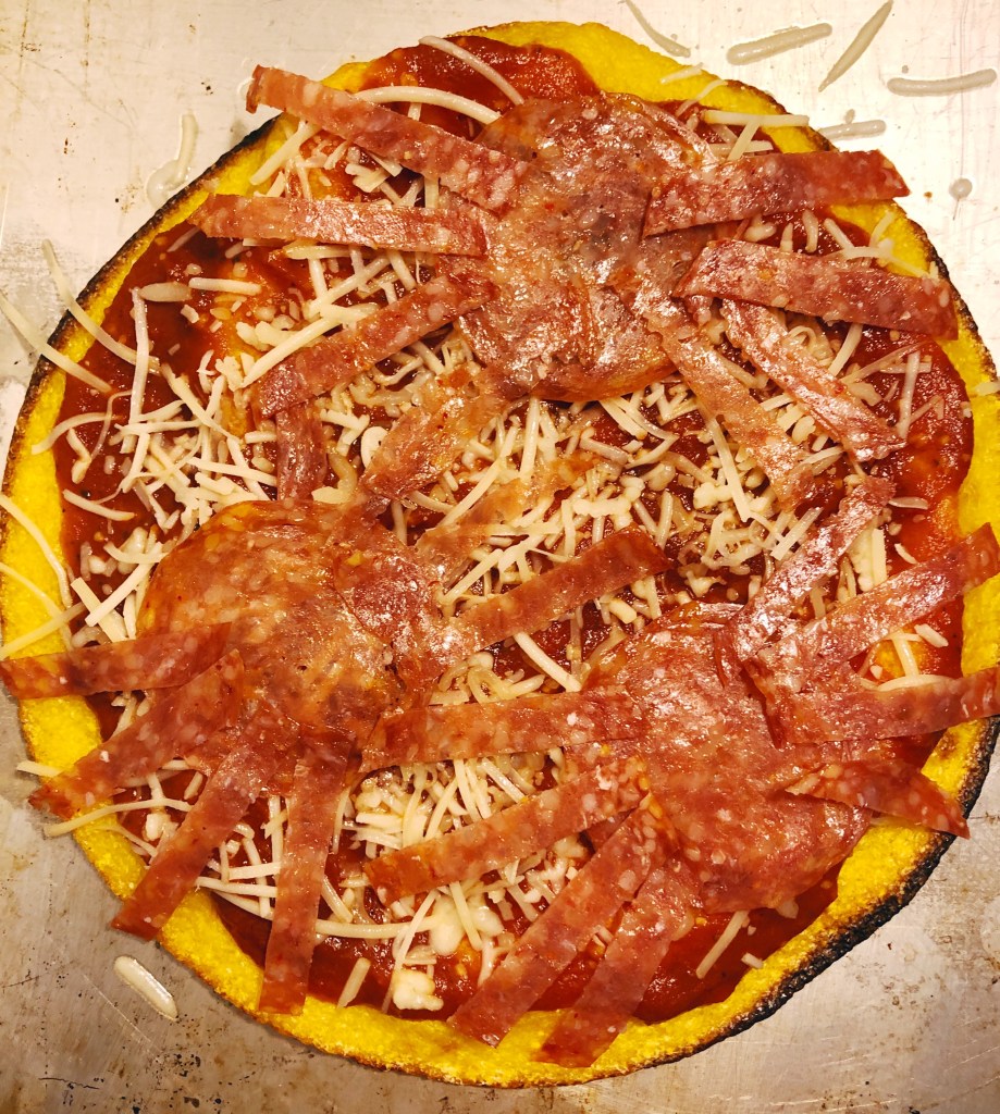 When the pizza crust was finally ready to be topped, I spread on the pizza sauce and added some shredded mozzarella. Next, I made a layer of salami spiders.