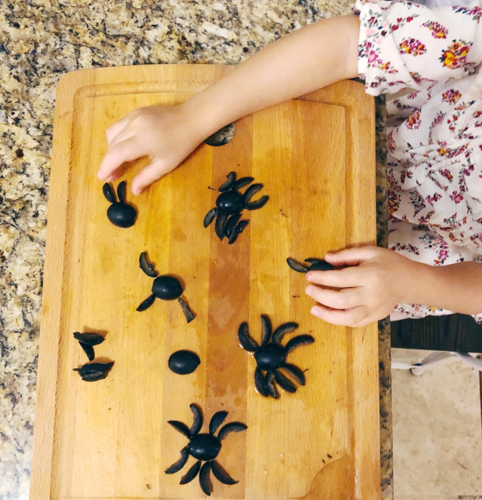 So, while the crust baked. MJ and I ‘spotted’ the red and black spiders and the ghosts, so to speak. Using whole black olives, I cut some in half lengthwise for the spider’s body, and I cut some into fourths lengthwise for the legs.
