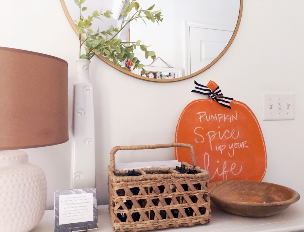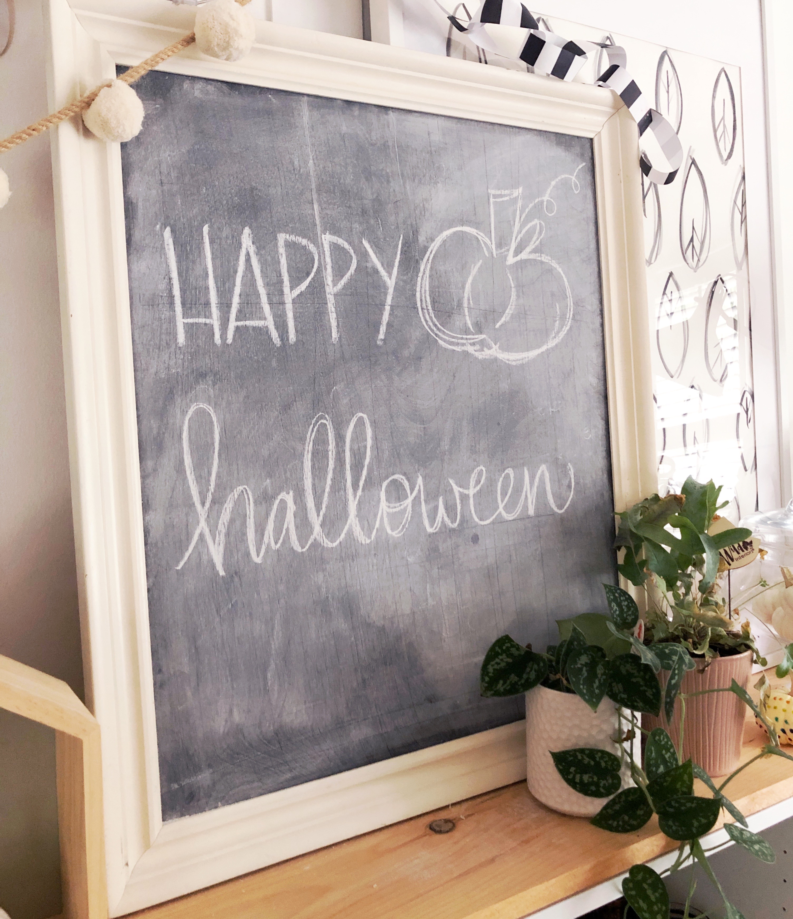 This is our little entry-way moment. I seem to have been feeling cheeky when I wrote on this pumpkin chalkboard.