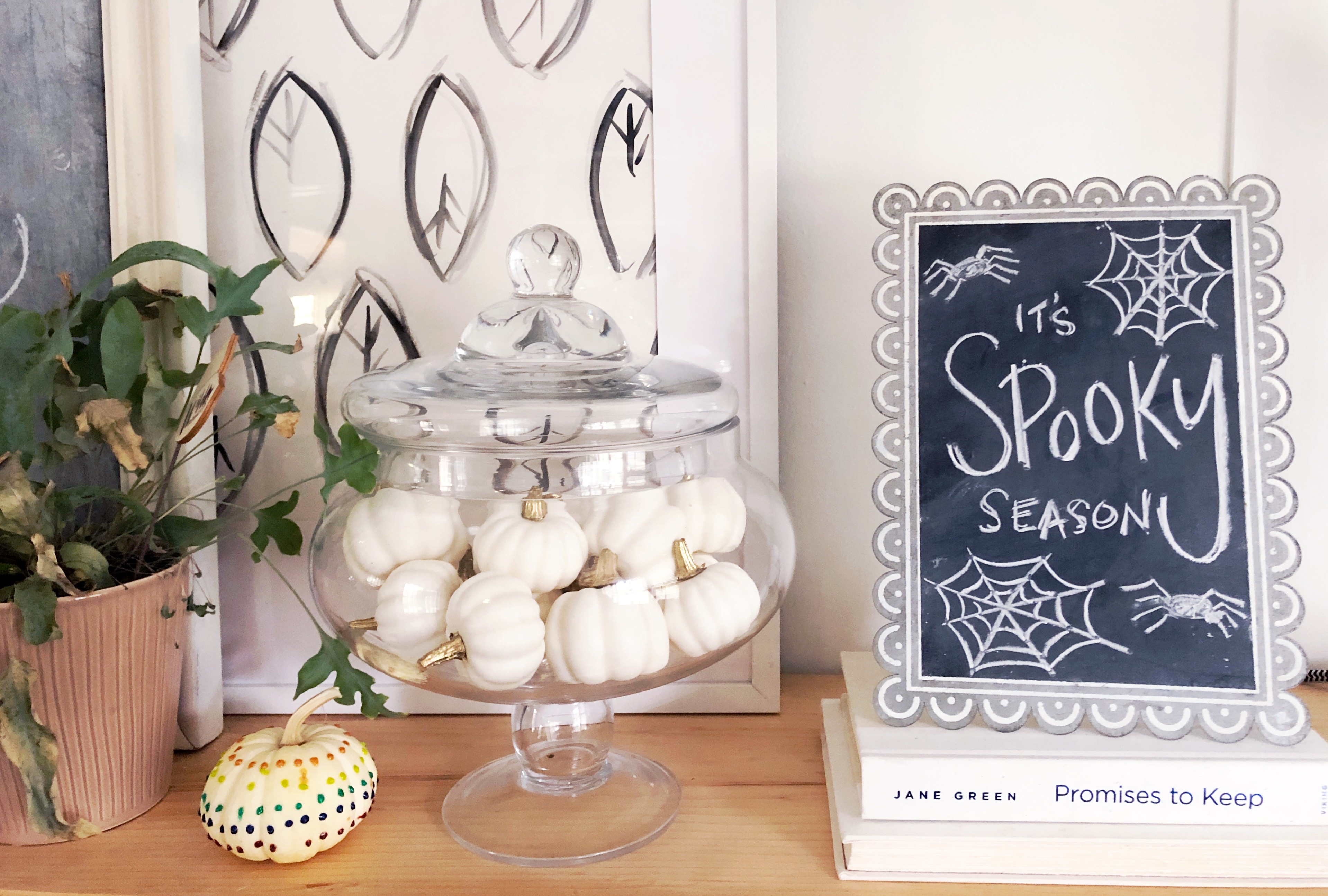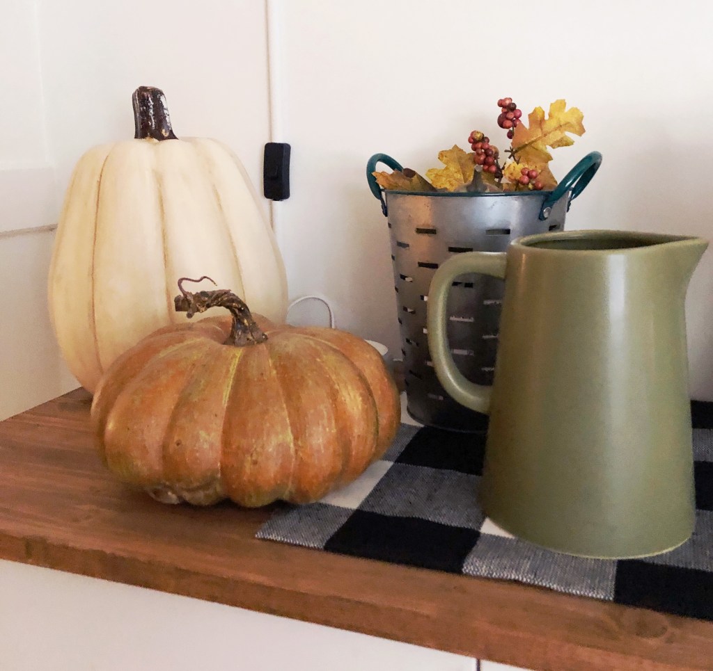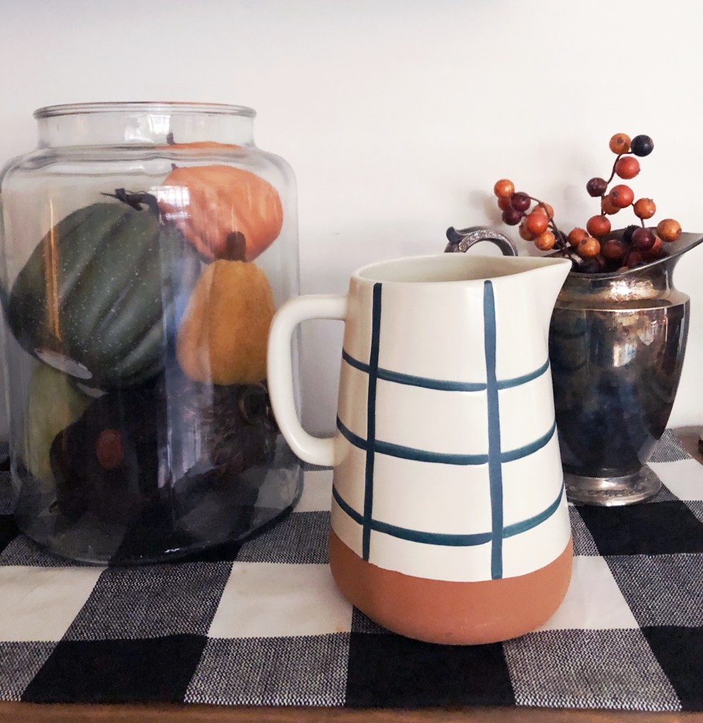 An apothecary jar is another easy element to switch out for seasons. On an everyday basis it holds faux lemons. New for this fall are these white and gold mini pumpkins from Target! Thank you, Mom!