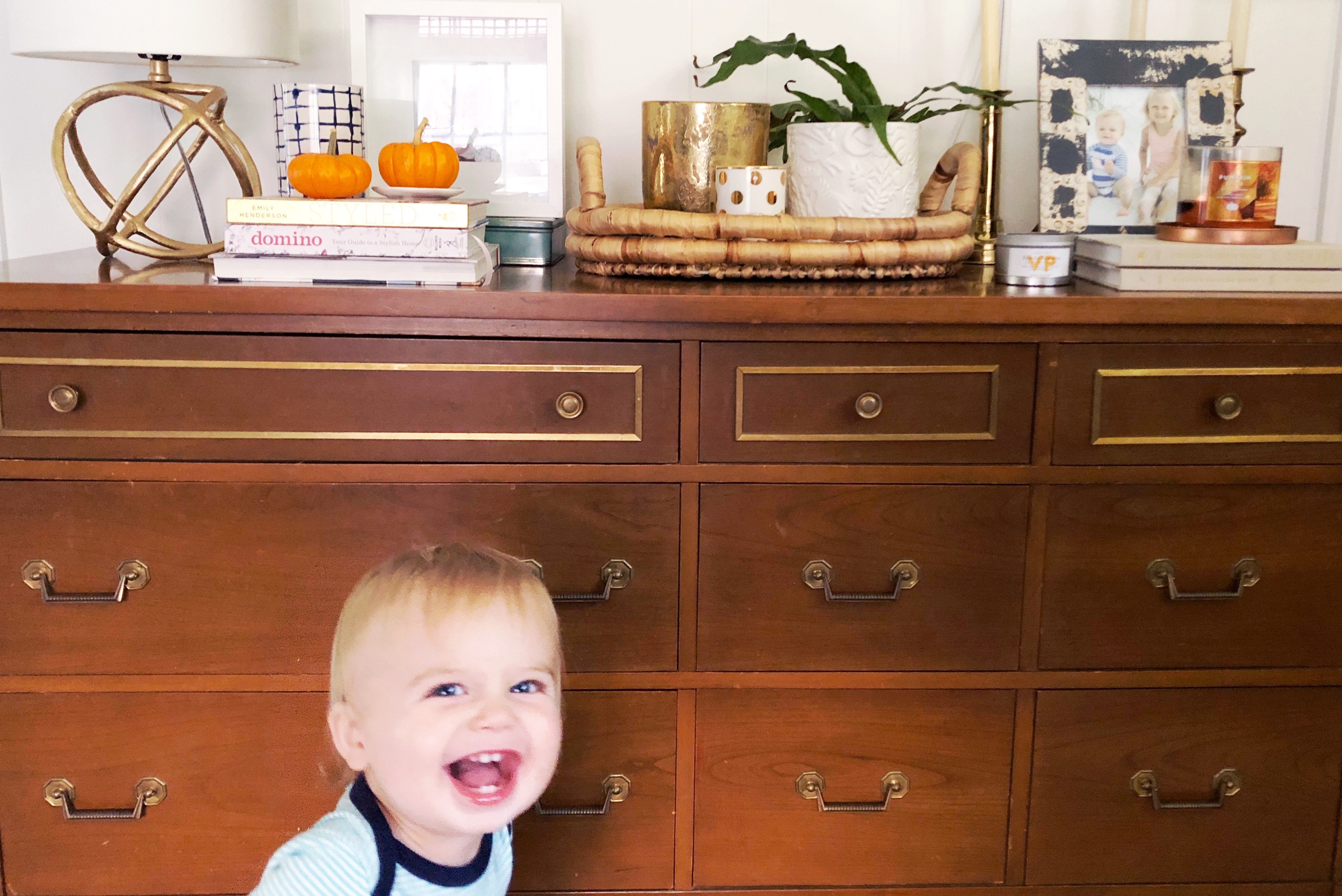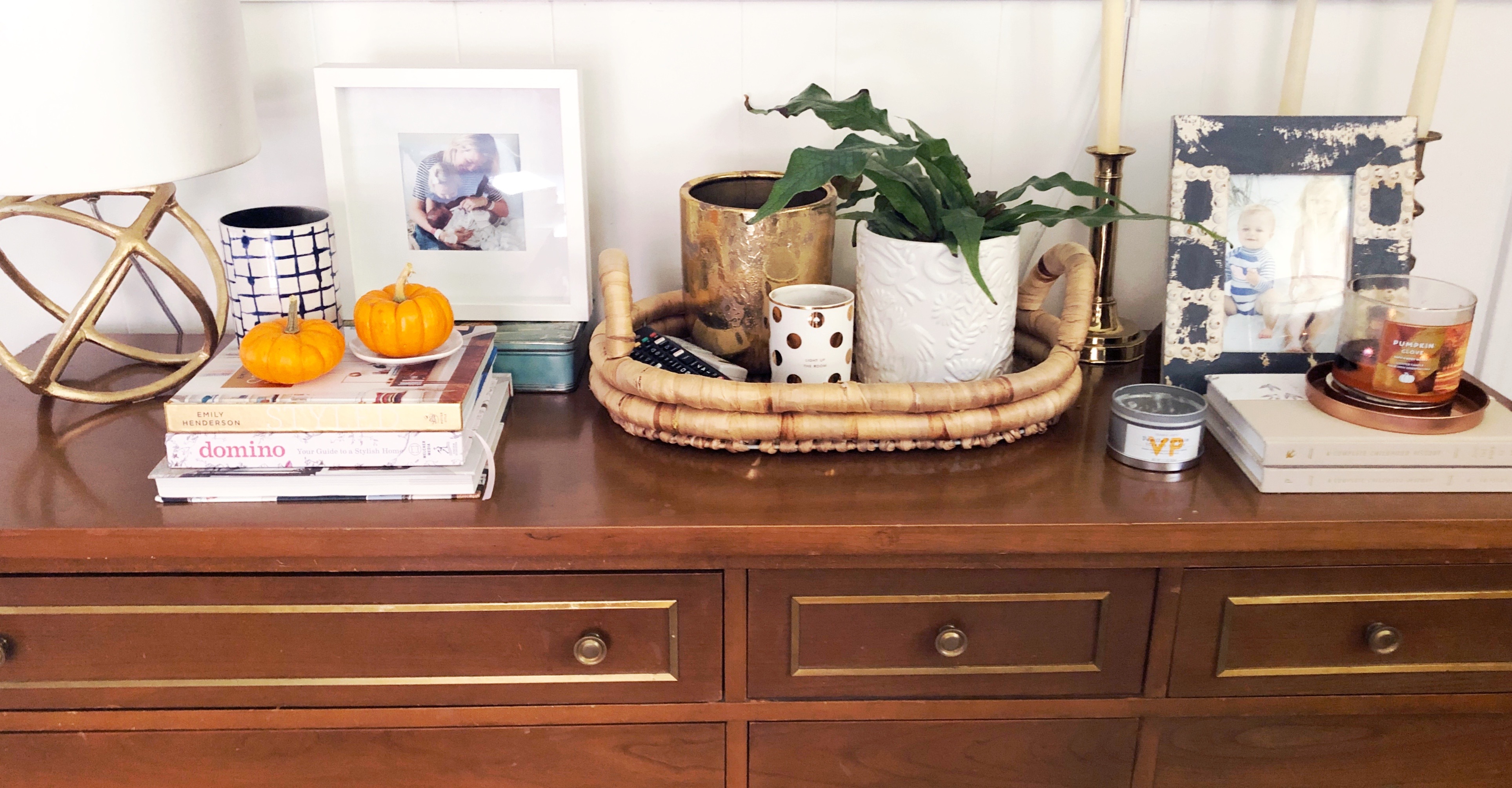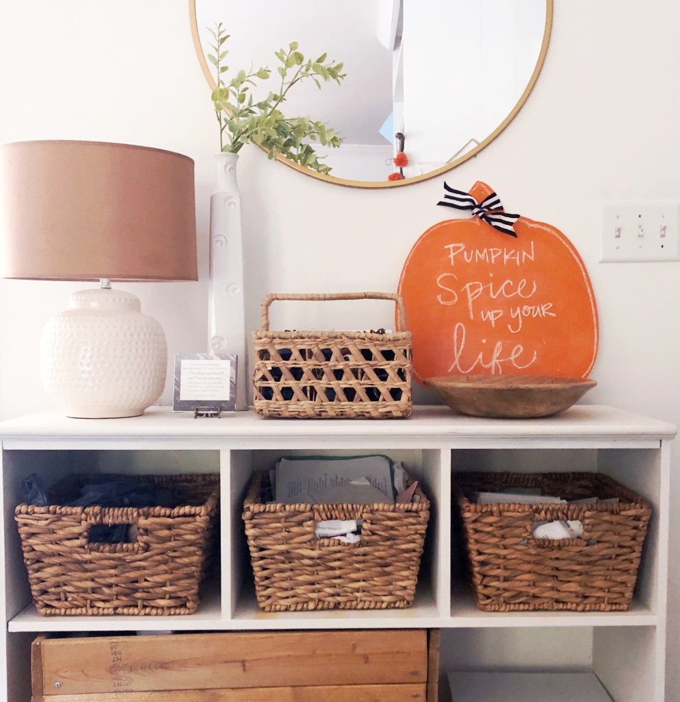An apothecary jar is another easy element to switch out for seasons. On an everyday basis it holds faux lemons. New for this fall are these white and gold mini pumpkins from Target! Thank you, Mom!