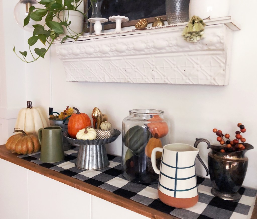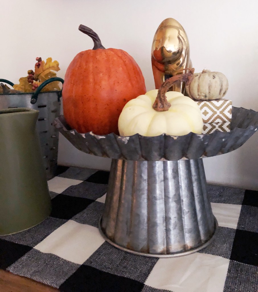 This time I rearranged the everyday containers, filled them with faux pumpkins and foliage, added a runner and called it Fall!