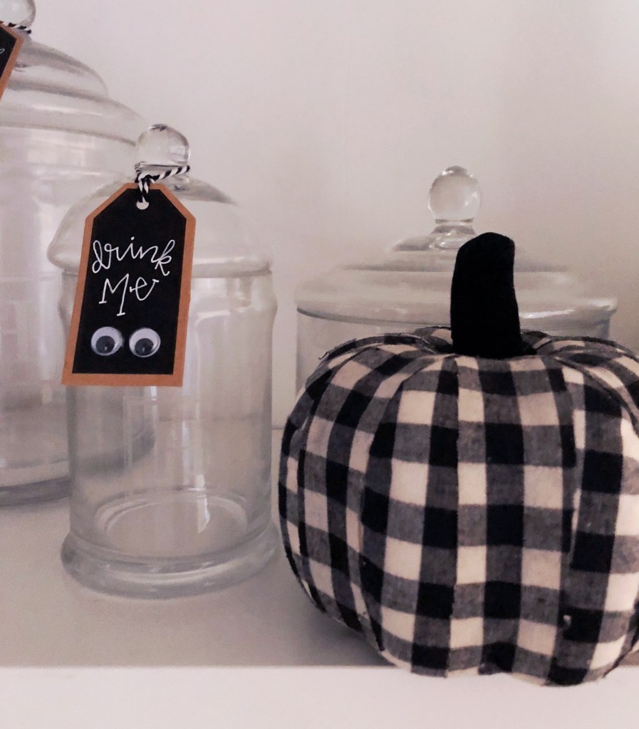 Honestly, I prefer our kitchen to stay super functional. So the addition of the tiny ‘Drink Me’ signs {from here} and the gingham pumpkin are all that made the cut.