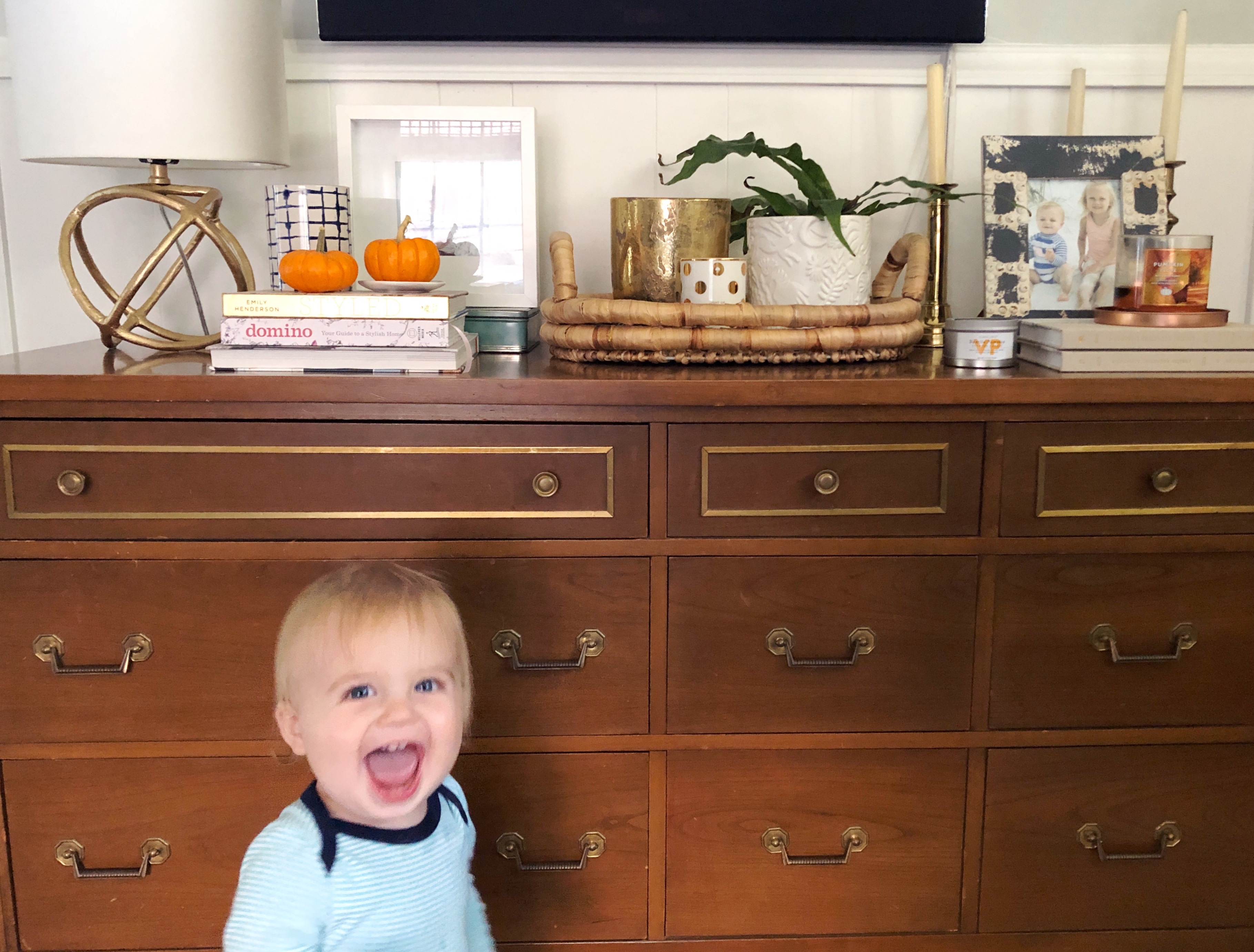 That tiny photo-bomber is the best part of this fall moment under our television. {scroll right}