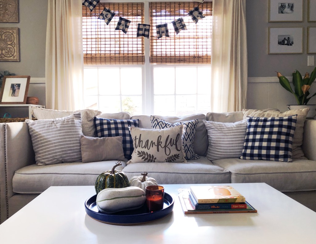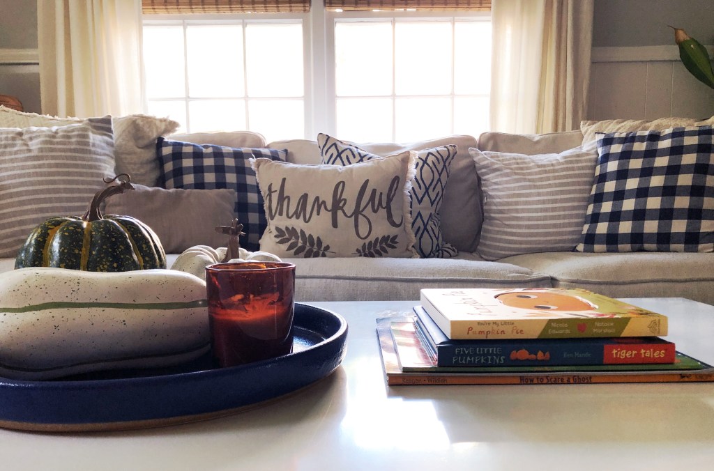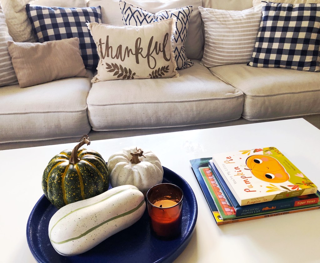 Threw in a ‘thankful’ pillow, ‘gather’ garland and filled our everyday navy ceramic tray with faux pumpkins and an orange candle. Done