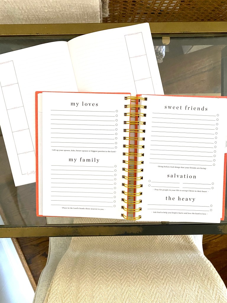 - Right before each month begins, you find some time to list out your prayer content. There are prompts. Of course, you can add to each section when you feel led.