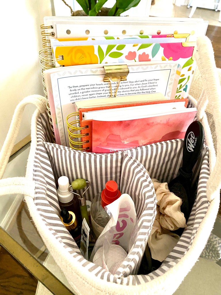 Before I go to bed, I make sure my desk is cleared off and all elements of my basket are accounted for. This one basket contains every single item that I use for my morning skin care routine and quiet / prayer time routine. All in one place. All together. No fumbling. No wasting time going back and forth to different rooms.