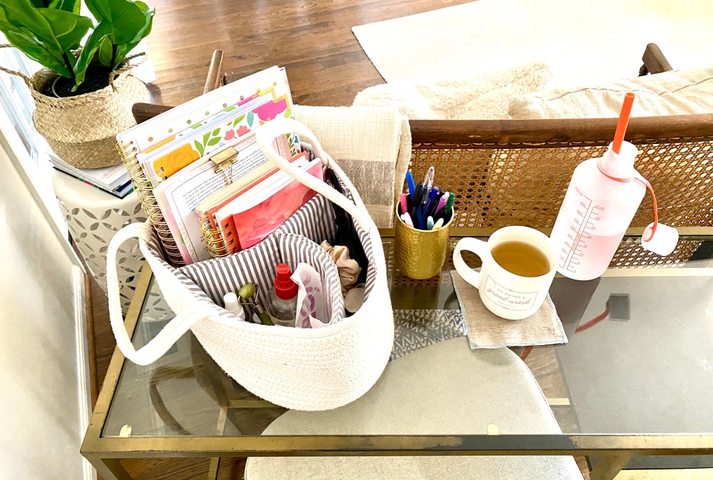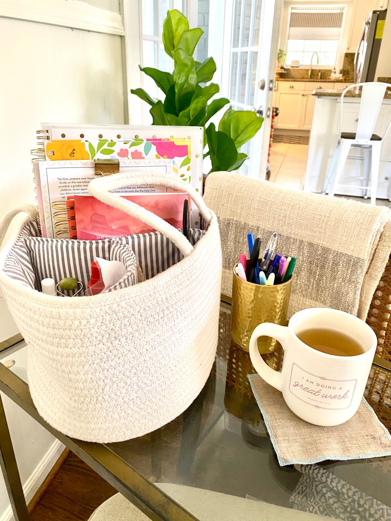 It’s been a month, so here ya go. Here is the routine and the contents of the basket that lives in my AM quiet time spot: